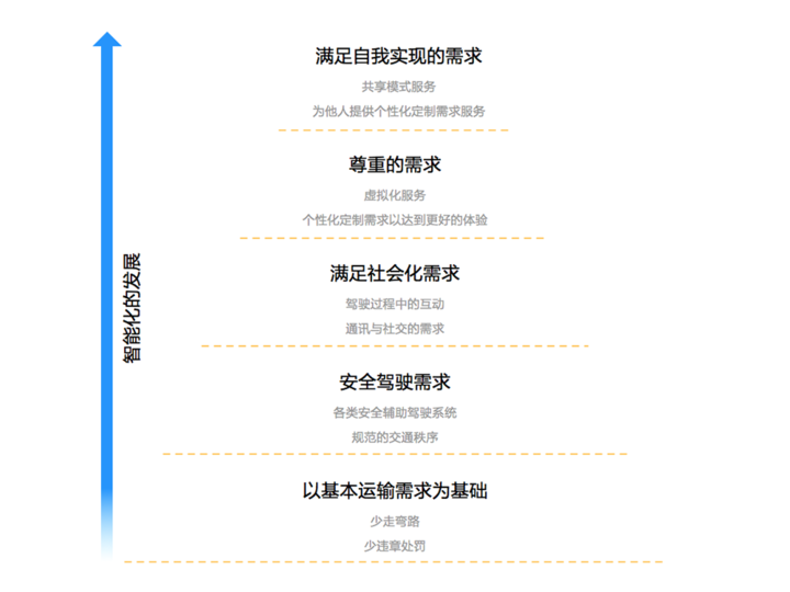 云端的服务器能够通过调度以最优策略来利用这种闲置资源,同时车主可以在自己的车上提供各种定制化的娱乐、办公和购物等等服务,这种方式除了能够有额外的收入以外,更多的是一种为造福他人而提供定制服务的自我满足感。 因此,随着汽车智能化的不断深入发展,依据马斯洛需求金字塔对驾驶需求层次进行划分如下:
