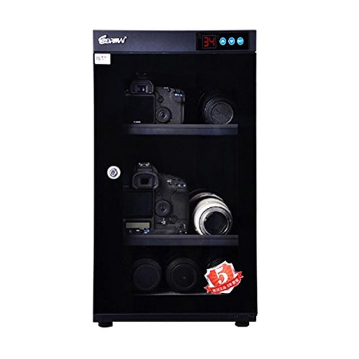 锐玛 MRD-55 电子防潮箱使用 LED 数字显示方式,微电脑按键式操作设定需要值和强劲的除湿机芯。具有除湿防霉防尘,节能等功能。三重电子电路保护装置,全方位确保长年运行的安全性。用于保护相机镜头或书籍以及带合金的藏品,也是不错的选择。