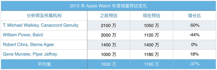 就平均值来看,这几位分析师对 Apple Watch 的预期年度销量是 1190 万,比起他们一年多以前的预测下降了 37%。