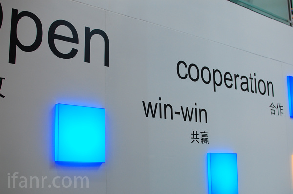 先说中国移动,他们是 MAC 大会的铂金赞助商,也是展览区内最“阔气”的展台。在展台最显眼的位置摆出了 MM 专区,并且打出了“开放,合作,共赢”的口号。他们透露的一组数据是: