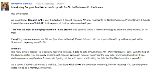 另一位开发者 Adi Rabinovich 在赞誉 Mohamed 的同时也表达了对 Google+ 官方 API 的期待。Mohamed 对此回复说,“我也一样,但我三月前已经开发了一款插件了,我一直等着却没有结果。所以我就这么干了。这还挺简单的,我正着手做些调整以期能让插件开发人员更方便的使用。”
