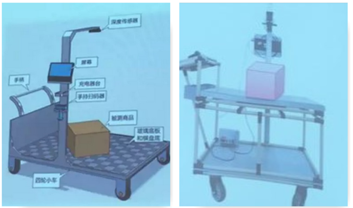而这个项目的实际形态是一台小推车,看起来相当粗糙。它直接搭载了 640×840 分辨率的摄像头模组,再通过扫码枪、秤和小车上的笔记本完成对物体的测量和登记。
