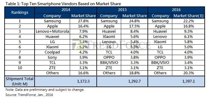纵观全球出货数据,TrendForce 称 2015 年全球智能手机出货为 12.92 亿部,同比增长了10.3%。这个速度相比过去几年的高速增长大幅下降,但仍旧超过了行业内的一般预期以及市场研究 IDC 公司“个位数”的增长预期。