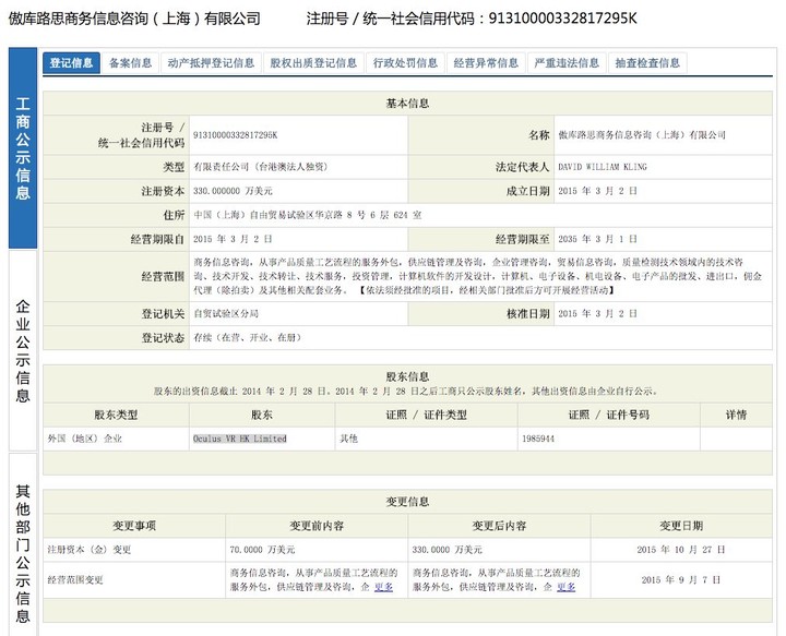 全国企业信用信息公示系统上显示,傲库路思商务信息咨询(上海)有限公司注册资金为 70 万美元,注册人为 DAVID WILLIAM KLING,公司类型为 “台港澳法人独资” 的有限公司。公司股东发起人一栏显示的是 “Oculus VR HK Limited”,有媒体猜测,这暗示了 Oculus 以香港分公司为跳板进入内地的想法。