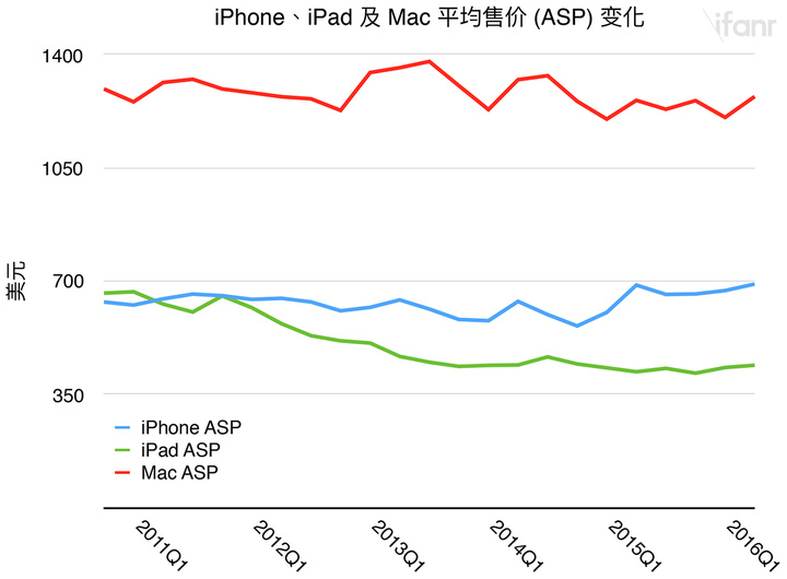 除此之外,苹果整体运营仍然十分健康,毛利率保持以往的 40% 左右,而运营支出仍然只占总收入的接近 30%,研发支出保持在 3.2%,而销售成本、综合开销及行政管理支出 (SG&A) 等非生产成本,亦保持在很低的 5% 水平(三星在 2015 年第三季度,SG&A 支出达 24.5%),证明其运营仍然十分高效。同时,苹果产品的平均售价 (Average Selling Price, ASP) 亦保持稳定(下图),在 iPhone 6 Plus 推出后,在大屏效应下,iPhone 的 ASP 更不降反升,相比去年同期亦有轻微增长,证明了苹果在高端市场的地位,一直没有被动摇。