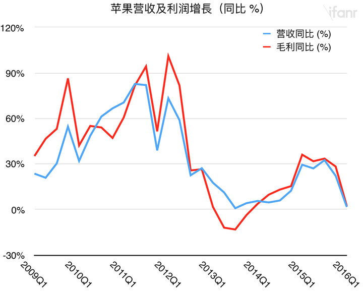 虽然苹果的业绩依旧亮眼,但与去年同期相比,就会发现苹果的增长率跌至新低:营收同比增长 12.73 亿,即 1.71% 的增长率;iPhone 销量比去年同期轻微增加了 311 万,增长率 0.1% 不到,远低于分析师预期的 2.07%-3.53%;iPad Pro 推出并没能带来帮助,iPad 销量继续倒退 21%(IDC 指全球平板销量倒退约 7%),而 Mac 电脑也同时倒退 3%(IDC 指全球 PC 业倒退 10.6%)。