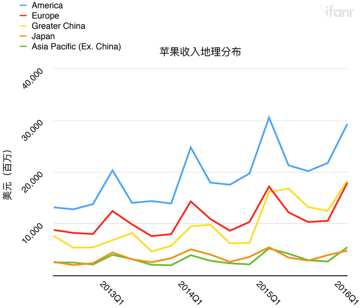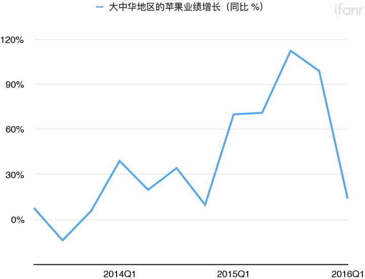 幸好在 2016 年首季,虽然苹果的美国业绩录得首次的同比下滑,欧洲地区亦增长无力,但大中华地区同比仍然增长 13.8%。