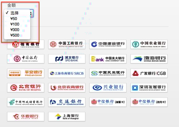 3. 填写个人信息后,可以看到“选择银行”的界面。用户可以选择 50 元、100 元、300 元和 500 元的面值对自己的 Apple ID 进行充值。