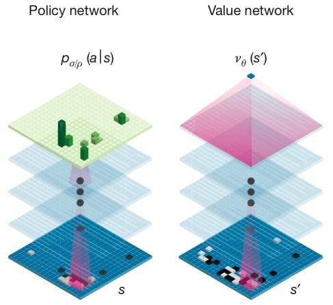 更通俗的解释是,策略网络着眼于当下,选择下一步走法。值网络思考得更加长远,预测棋局的走向。