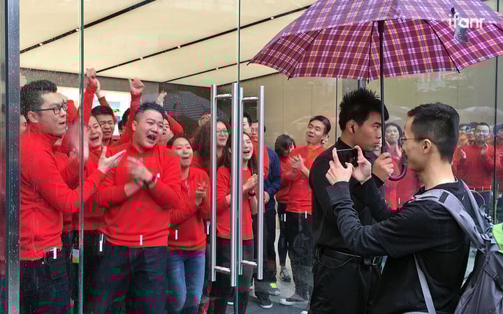虽然下着雨,但是苹果的粉丝们却早早聚集在天环广场,苹果在广州的第一家官方直营零售店今天正式开业,这家拥有两层楼的零售店拥有绝佳的地理位置,它所在的天环广场位于广州天河最繁华的商业区。