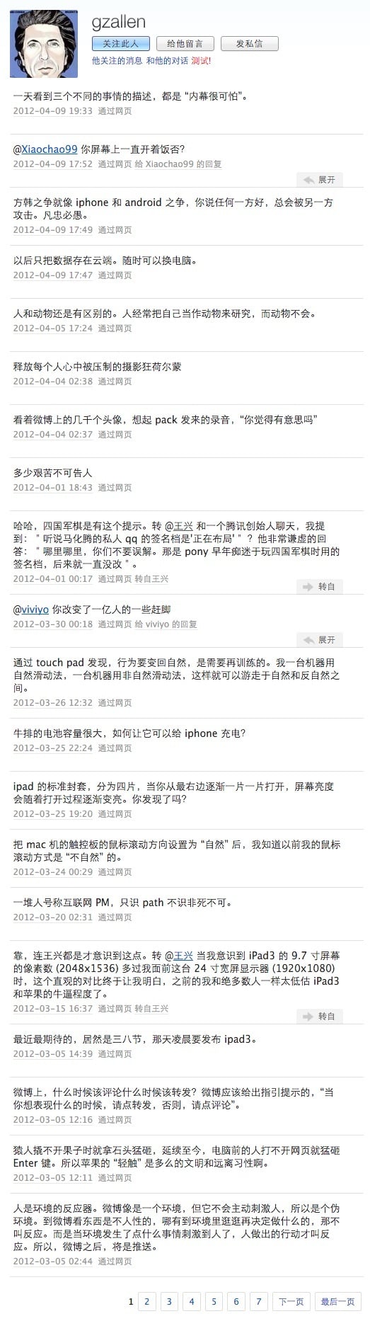 于是我登录饭否并搜索了“gzallen”,该帐号并没有采用隐私保护功能(可防止陌生帐号查看自己的信息)。饭否网每页能查看 20 条信息,单单在第一页里,张小龙就做了一个正常网民会做的几乎所有事情:对生活中的细微现象进行分享和吐槽、发产品名的时候不理会大小写、震惊的时候会说脏话、记录生活细节、归纳所见事物的规律。在后面几页里面,他还会随手拍个图片上传,没事展示一下文采。
