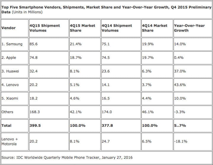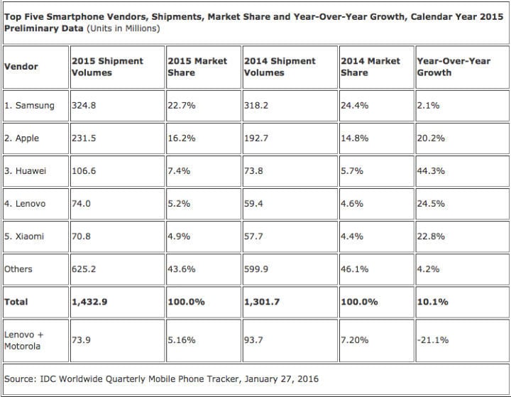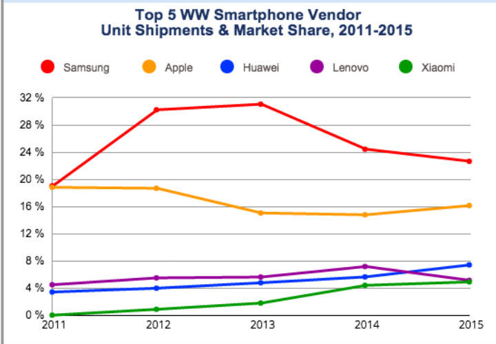 2015 年智能手机销售记录创新高,国产华为成最大赢家