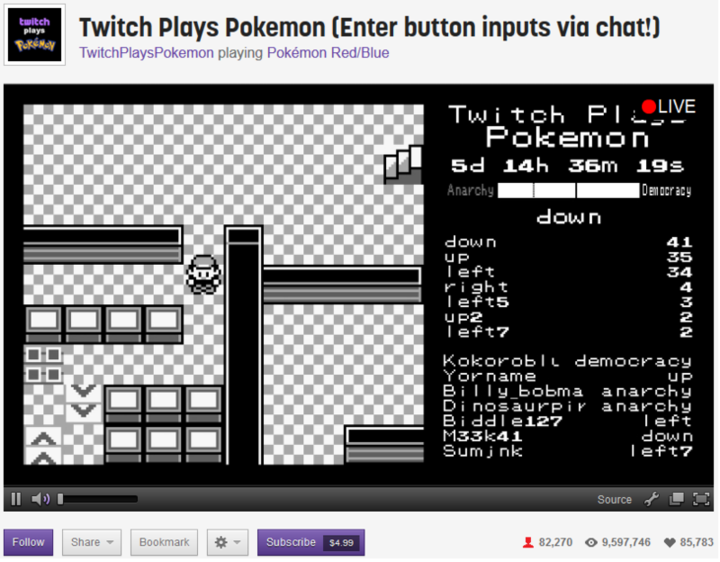 除了国内常见的弹幕外,国外的直播风潮引领者 Twitch,则在“高互动性”内容的探索上越走越远——2014 年发起 Twitch Plays Pokémon 实验性项目,让大众参与到游戏玩乐的过程当中,