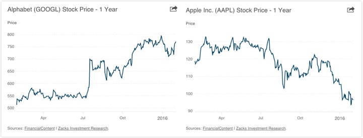 反观苹果,2016 年第一季财报增长率跌至新低:营收同比增长 12.73 亿,只有 1.71% 的增长率;iPhone 销量比去年同期轻微增加了 311 万,增长率 0.1% 不到,远低于分析师预期的 2.07%-3.53%。下图是 Alphabet 和苹果近一年的股价走势对比。