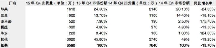 以下为各大厂商平板电脑去年第四季度的具体数据: