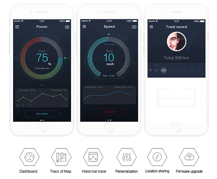 通过官方 app,用户可以检查目前的车辆行使状态,速度及电量等,打开 GPS 定位甚至可以记录用户的行使路线并生成报告。