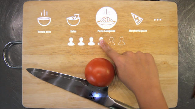 我们也可以用一个方便的办法来模拟出增强现实的效果,那就是用投影仪将电脑界面投到我们周围的任何平面上——比如桌子、墙壁,以及家里、办公室和公共空间的地板上。如果足够普及的话,我们就能用这种方式离开电脑进行人机交互了,我们就能在厨房里忙得不可开交时——也就是双手和台面都沾着东西的时候——与电脑进行交流并且寻求帮助。这也意味着在双方共享的平板电脑上用投影仪就能实现面对面的合作,那么任何平面都能成为投影屏幕,并且能如我们所愿,呼之即来挥之即去。