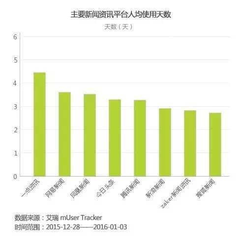 而今日头条合伙人、高级副总裁张利东发则在朋友圈贴出了两张数据图,分别是艾瑞报告中的“主要新闻资讯平台日均活跃用户数”和“主要新闻资讯平台人均使用天数”。在前一个图中,今日头条的 DAU(日活数)为 967 万,排在腾讯新闻与一点资讯之后;而在后图则排名第四,排名前三为一点资讯、网易新闻和凤凰新闻。