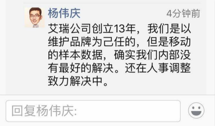 另外,在张利东这条朋友圈下,艾瑞的董事长杨伟庆自身也承认了他们在移动样本数据上是存在问题的: