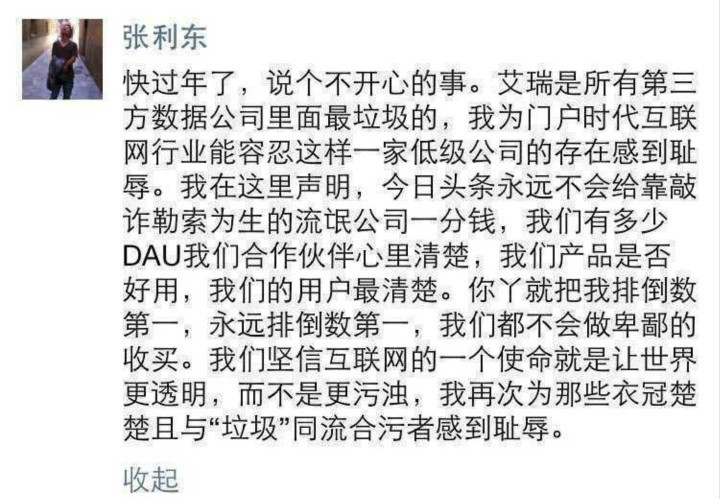 今天中午,今天头条的创始人兼 CEO 张一鸣发了一条言辞激烈的朋友圈,主要内容是认为在艾瑞推出的报告中今日头条相关数据不实,但“不会做任何妥协”,之后将“禁止公司任何部门和艾瑞有任何合作”。