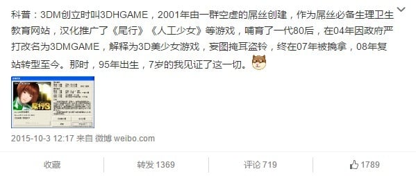 看到这条微博,我脑海中浮现出曾在 3DM 下载过的十几款游戏,以及这些游戏陪我度过的几百个小时,不免有点儿“致青春”的感慨:正版游戏时代来了。在游戏版权无政府主义时代,3DM 等破解汉化工作室撑起了宅男的精神家园,这是谁都无法否认的伟大功勋。但如今,版权已不再是开玩笑,人们越来越习惯于为知识产权付出应当的代价。游戏这块长久被海盗统治的港湾,终究要顺应时代潮流,转变成为阳光下的国土。