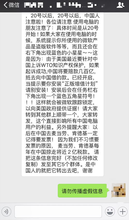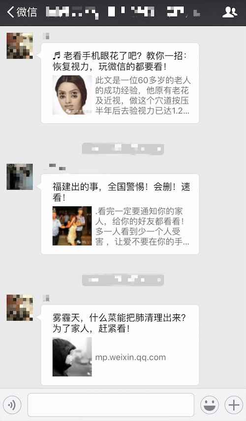 在微信传播信息的风潮正劲的时候,很多年长的用户对网络信息还很陌生,面对突如其来的信息量暴增,没有一点点防备就被冲晕了。由于不知道网络上充斥着谣言,他们多数没有判断信息真假的意识,面对文章附上的“请立即转发”,还会不自觉地进一步传播信息……群里一整年都是这样的: