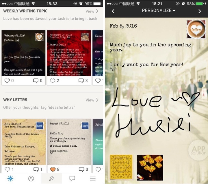 肚子喂饱了,接下来得来点更浪漫的。帮 TA 擦去嘴角食物的片刻,顺便奉上一封情书。对,就是要让 TA 甜蜜地不要不要的。不需要前期准备漂亮的信纸,Lettrs 可以帮你做出一封精致有爱的情书。Lettrs 有不同风格的信纸,字体和排版也都能自动搭配好。写完信后还可以贴上不同的邮票,插入多张图片并手写签名附在信的末尾。