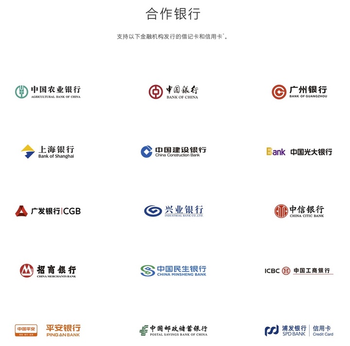 据 Apple Pay 登陆中国时的消息,Apple Pay 在中国将支持中行、建行、工行、招行、广发行等 15 家银行的借记卡和信用卡(现已增长到了 19 家银行)。未来还可以将常用的积分卡添加至 Wallet,并可通过它们来使用 Apple Pay 换领积分奖励。