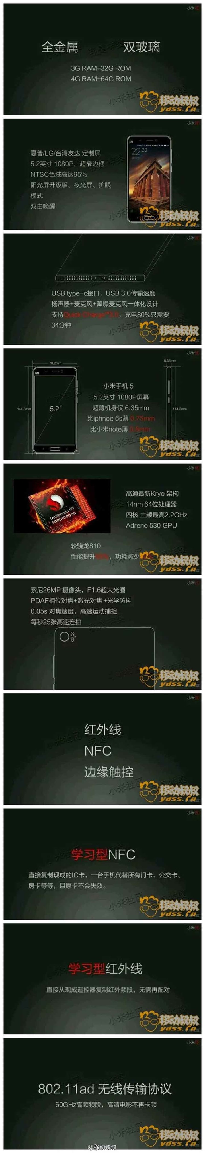 中框还不具备清晰的信息识别性,而又有一位微博用户 @移动叔叔直接贴出了号称这次小米新品发布会的 10 页 PPT。这组 PPT 几乎涵盖了小米 5 的全部信息,包括快充、配置等极其详细的 SPEC 信息。