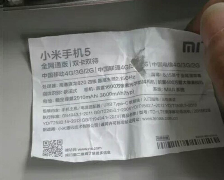 图片显示,小米 5 会采用高通骁龙 820 处理器、5.15 英寸屏幕、支持指纹识别、电池容量为 2910mAh;3000mAh(typ)、支持全网通。不过值得注意的是,贴纸展示出的 1600 万像素光学防抖相机 + 400 万像素前置相机组合与 PPT 曝光的信息有出入。