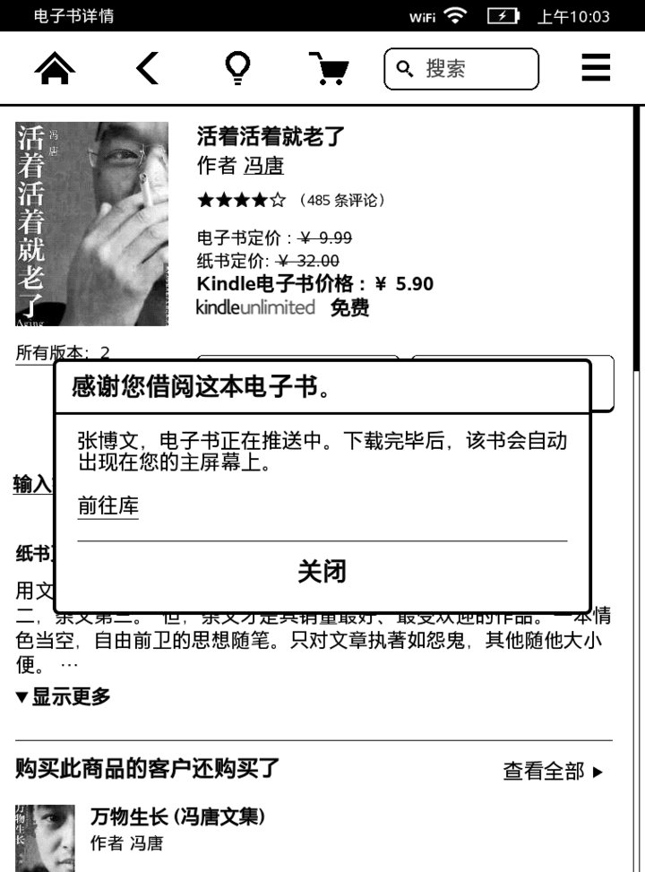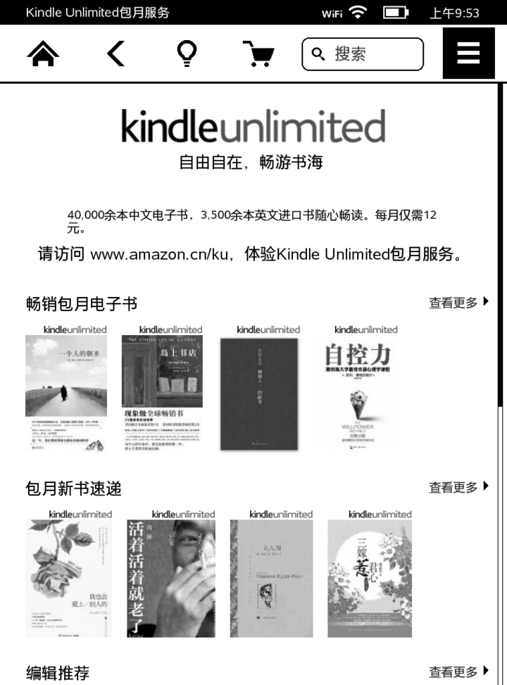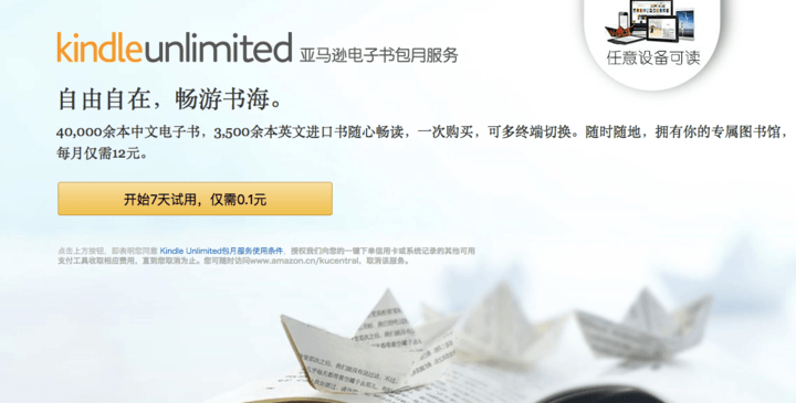 如今,这个服务已经来到中国,在亚马逊官网和 Kindle 上,中国版的 Kindle unlimited 已经上线,比起美国版 9.99 美元的月租费,中国用户每月只需支付 12 元,便能无限量阅读亚马逊中国 Kindle 商店中的 4 万余本中文电子书和三千多本英文原版书。读者可以用 0.1 元来试用 7 天。