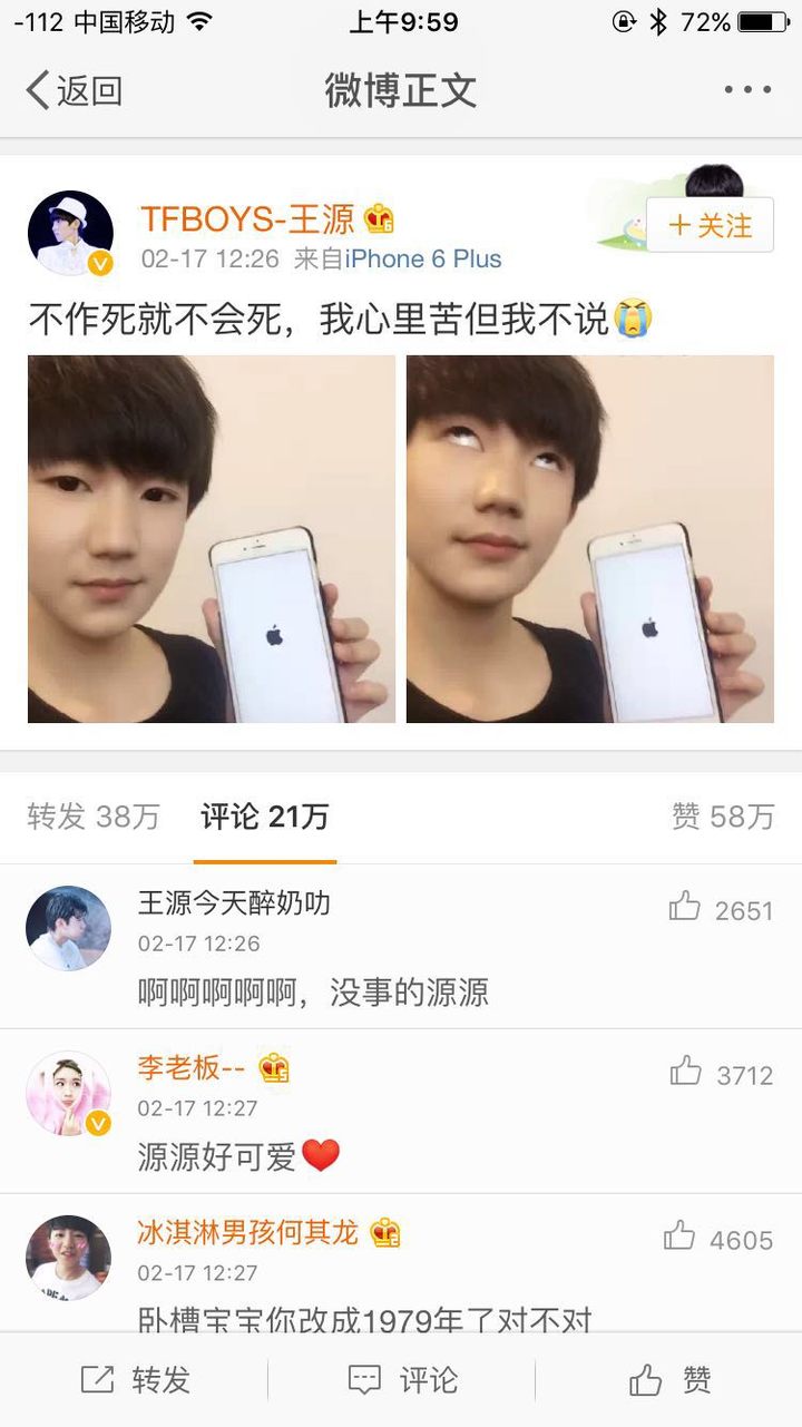 最近一段时间有关 iPhone 变砖的消息可着实不少,除了两周前卫报曝出的这次 “五三” 变砖,前将 iPhone 时间设定为 1970 年 1 月 1 日后手机变砖的消息也是刷遍了整个网络,不少好奇的用户在得知这个消息之后好奇的将手机的时间调到了 1970 年 1 月 1 日,当然这些人也为自己的好奇心付出了代价,难逃手机瘫痪的噩运。这其中就包括 TF Boys 的成员王源。