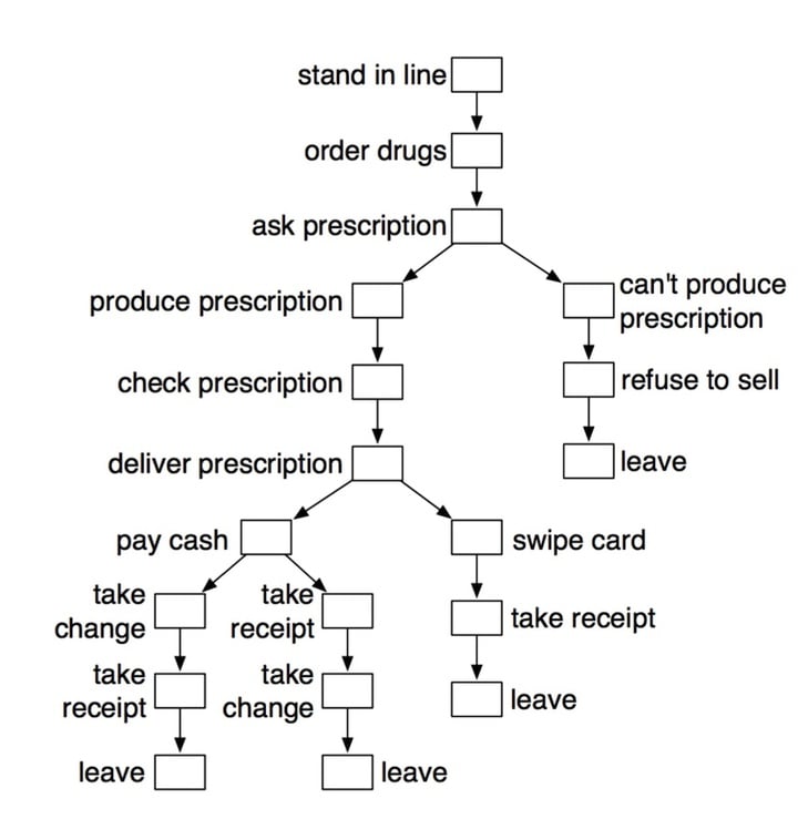 由于不同作者对同一件事的描述必定有不同,因此需要大量的简单故事样本,这样才能保证故事里情节倾向于全面、完整。于是研究人员把写故事的任务众包出去,请志愿者不用修辞地描述一件事——也就是机器人的任务——买药。通过分析大量故事提取出几条情节分支,形成一棵策略树,这棵“树”就代表了符合人性的买药步骤。