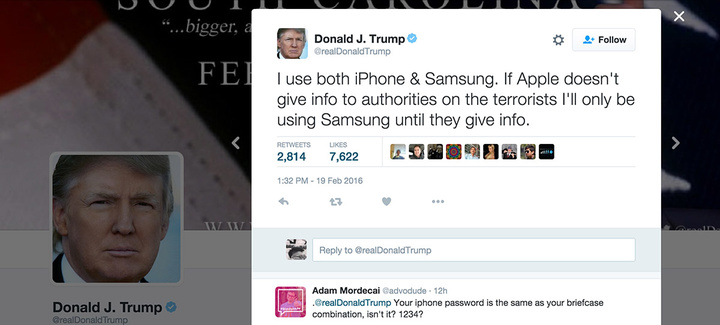 正在为总统选举杀得不可开交的共和党和民主党也在这件事上放下竞争走到了一起,在野党总统候选人特朗普(Donald Trump)也在 Twitter 上宣称如果苹果不帮忙解锁手机,他将抵制苹果产品: