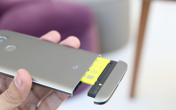 可更换的机身底部,成为了 LG G5 最大的亮点。只需拔掉机身底部,便可把机身底部的部分更换为拍照模块或 Hi-Fi 音乐模块。其中,Hi-Fi 音乐模块与 B&O 合作,提供 DAC 独立解码芯片。