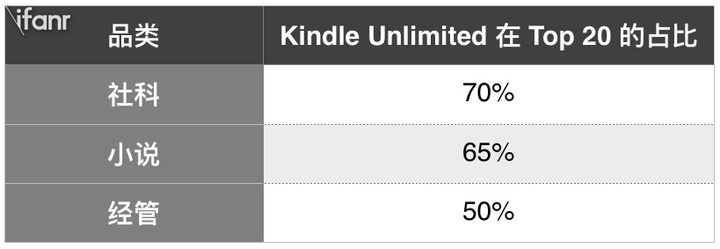 不过,爱范儿拿到了头部好书的比例数据。截至 2 月 22 日,社科类在 Kindle 排行榜上面前 20 的图书,可以用 KU 借阅的比例最高,为 70%。小说和经管类的比例分别为 65% 和 50%。