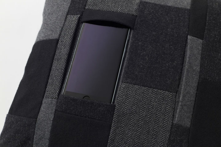 这款 Mobile Cushion 看上去是一个抱枕,但实际上它是专为解决在沙发上看手机等智能设备但无处放置这个问题而生的。抱枕采取暗色调的柔软材质设计而成,由多块布缝合组成,并缝有符合手机、平板等尺寸的边套,只需将手机等卡在边套内,就可随意调整抱枕的位置,找到最合适的观看角度。