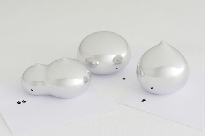 所谓压书石也就是中国古代的镇尺。在如今倡导无纸电子化办公的时代,Nendo 设计工作室设计了一款压书石。他们从经典的中华文化中汲取设计灵感,利用不锈钢为基本材质设计成这款具有逗号、句号、引号等标点符号的压书石。每个标点压书石都有不一样的分工,要将逗号压在未完成的文件上,在已完成的上面压上句号,最后在引用的资料页压上引号压书石。看似将办公明晰化,但无形中却增加了麻烦。