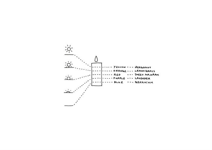 这款蜡烛看上去和普通的白蜡烛没有什么区别,但仔细看它的芯你会发现其中的大不同,芯内采用日落时天空的色彩,分别是黄色、橙色、红色、紫色、蓝色。当点燃后随着时间的增加,蜡烛的减少,颜色也会发生变化,其次同时会散发出不同的香味,像是佛手柑、香芋、田墨角兰、薰衣草、天竺葵等不同的味道。他们希望用户可以通过味觉感受时间的变化。