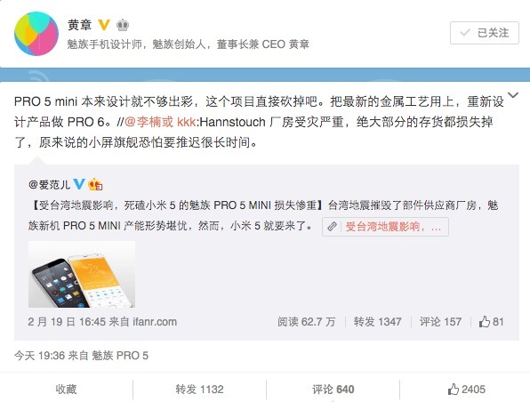 李楠的转发不过就是事后的验证,但后来魅族董事长兼 CEO 黄章的一条微博却直接宣告了 Pro 5 mini 的死刑: