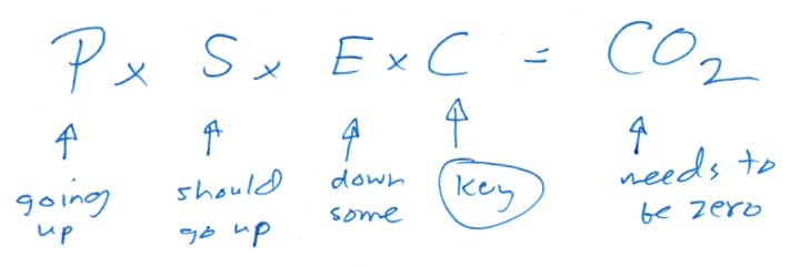 等式右侧代表我们向大气中排放的二氧化碳总量(CO2)。我们需要将这一数值变为零。这取决于等式左侧的四个因子:世界总人口(P);每人所使用的服务(S);提供每项服务所需要消耗的能源(E);以及最后该能源产生的二氧化碳。