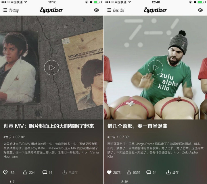 而在这个逐鹿者众、竞争激烈的视频领域中,应用开眼视频把目光放在了精品短视频推荐上。这个曾经获得多个应用方面奖项的 app,每天精选 5 条高清短视频,内容涵盖创意、运动、广告、音乐等方面,希望“让你大开眼界”。