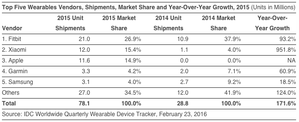 可穿戴市场的霸主依然是 Fitbit ,2015 全年销量为 2100 万,相比 2014 年的 1090 万,激增 93.2%,但由于这个幅度远小于小米的 951.8%,并且这个行业又来了苹果这样一位重量级玩家,所以 Fitbit 的市场份额从 37.9% 下跌超过 10%,至 26.9%。