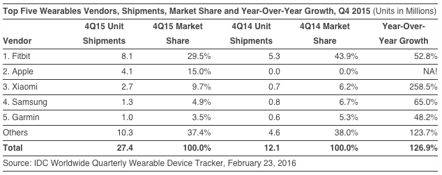 虽然在 2015 年第四季度,苹果的表现好于小米,小米全年在整个可穿戴市场的表现仍然是可圈可点的。相比 2014 全年售出 110 万只小米手环的成绩,小米在 2015 年销量暴增超过 900%,达到了 1200 万只的销量,市场份额也从 4% 暴涨至 15.4%。
