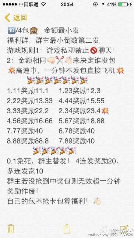 就算不翻看法律条文,普通群与红包赌博群也不难分辨。赌博群有简明的规则、陌生的群友、高额的奖金(当然概率低)、维持秩序的群主。这些群的名字要么叫做“微信红包接龙”,要么直接用玩法当名字“X 元 Y 包”(一次发 X 金额,Y 个红包)。新华社报道中提到了两个群的规则细节:
