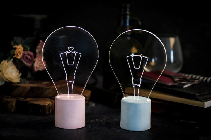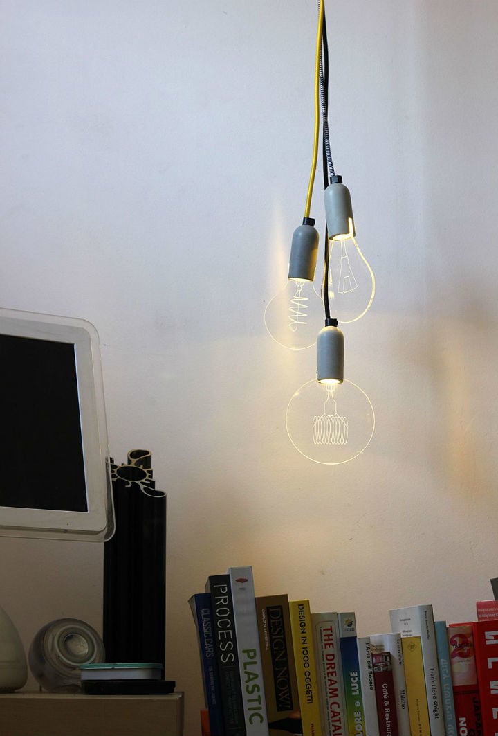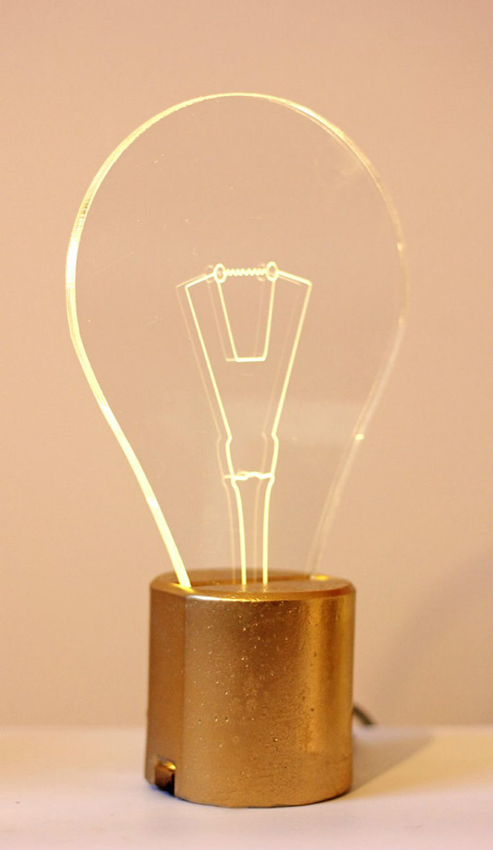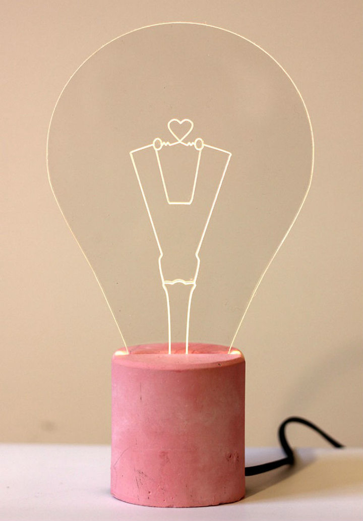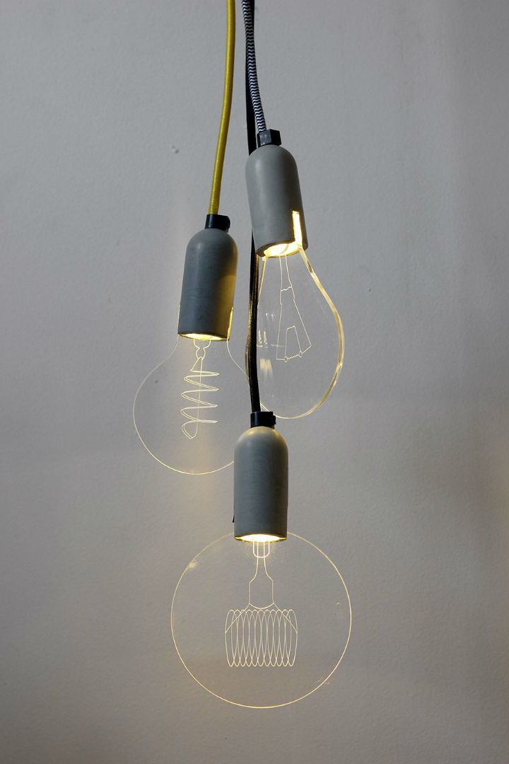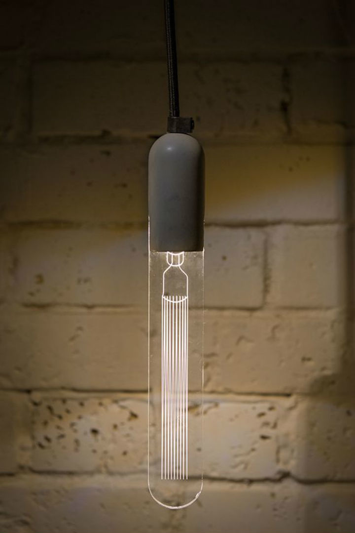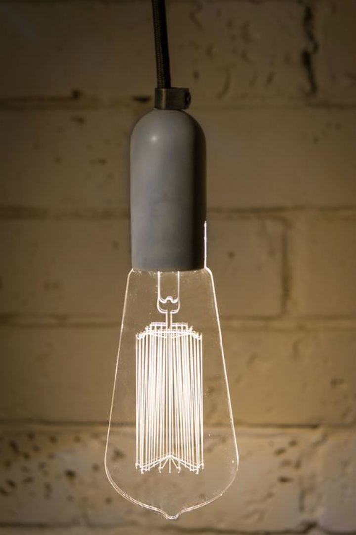 看腻了普通圆形的白炽灯,他们将灯泡变成扁平化形状。灯座基底选用混凝土为基本材料,而灯泡则采用了激光切割的有机玻璃制作而成,这款灯有三只灯泡,每只灯泡内的灯丝形状都不相同。