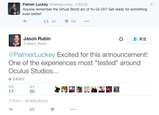 “童年回忆”以及二次元的影响力几乎在全世界范围内都通用,虽然我们并不能从 Luckey 这句话中得知什么很详细的项目细节,但这条发布于今天下午 1 点 15 分的推已经吸引了 304 人转推以及 434 个“喜欢”。@ChrisUnderoath 用这样一张 GIF 表达了对 VR 版游戏王的期待: