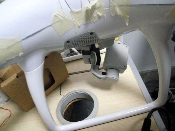 正如先前我们在谍照所预计,大疆将在新一代精灵采用新的云台。在上面的谍照里(上图),我们不肯定大疆是否如传闻一样,再改良了其 Lightbridge 图传、将会使用可以 360 旋转的云台或 360 全景相机、又或是目前极为罕见的 6k 相机,但除了 Lightbridge 图传难云台改用了更稳定的双臂式设计,而在云台的上方、无人机的机底,加入了精灵 3 所没有的大量散热口,估计是为里面可能的配件散热,包括:更强运算能力的飞控、或是正如上次谍照显示:在机底也加入了 Guidance 的视觉定位系统。