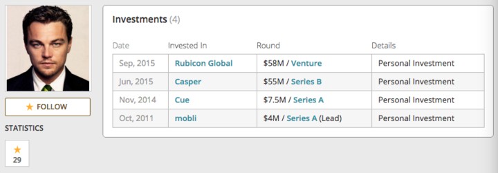 在 CrunchBase 上,我们可以看到小李子的投资史始于 2011 年,在最近两年开始活跃了起来,而且所投项目融资资金也越来越高。照着这个趋势,加上奥斯卡小金人已经到手,小李子会不会把事业重心更多地放在投资这件事上呢?毕竟在好莱坞,曾经扮演乔布斯的艾什顿 · 库彻就是一个很好的例子。