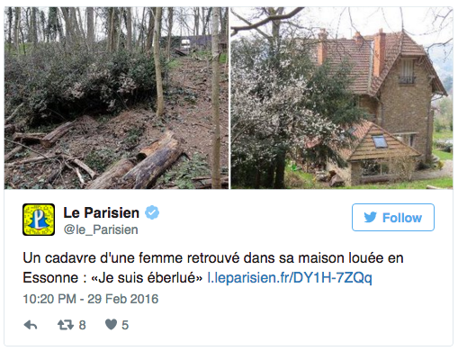 如果要给巴黎那几个经历 Airbnb “尸体惊魂”一事的小伙伴设计台词,我觉得这一句是很合适的。上周末,他们通过 Airbnb 预订了一栋在巴黎近郊的房子,打算来场周末狂欢,可惜却在房子靠近森林处发现了令人毛骨悚然之物:一具女尸。